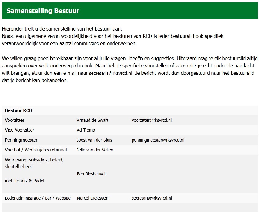 De samenstelling van het hoofdbestuur en de bijbehorende kernbeleidsgebieden is als volgt: